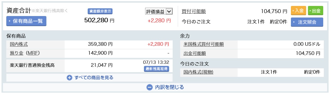 伊藤忠株を買い、5,500円程の含み益になった評価損益も、みずほ銀行株を買ったら0に近づきつつあります。